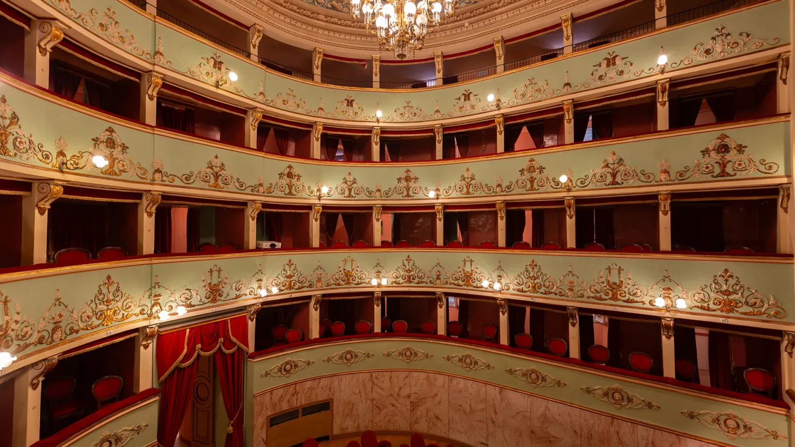The Teatro Serpente Aureo in Offida preserves two of the original curtains, which are of great historical value. The first curtain shows the legend of the mythical Golden Serpent (serpente aureo). The second shows an idyllic scene with four Muses. The theatre uses both manual rigging with ropes and motorised rigging, providing flexible, dynamic control of the stage equipment during performances.